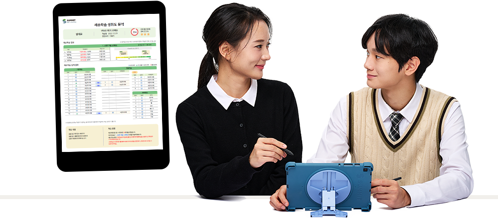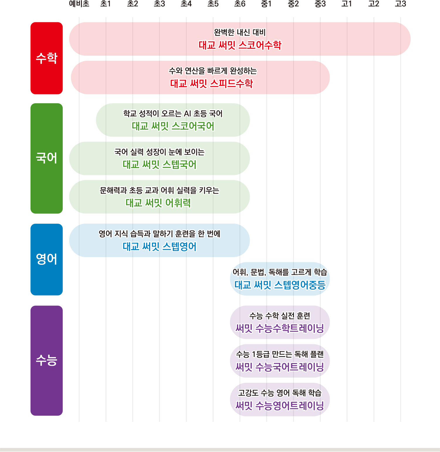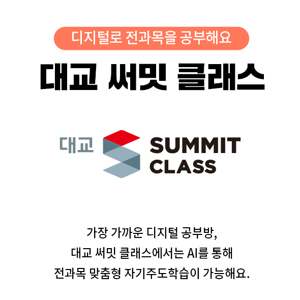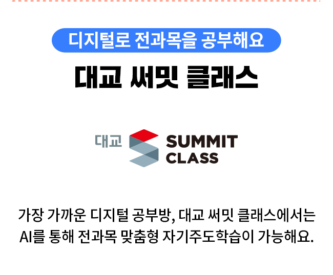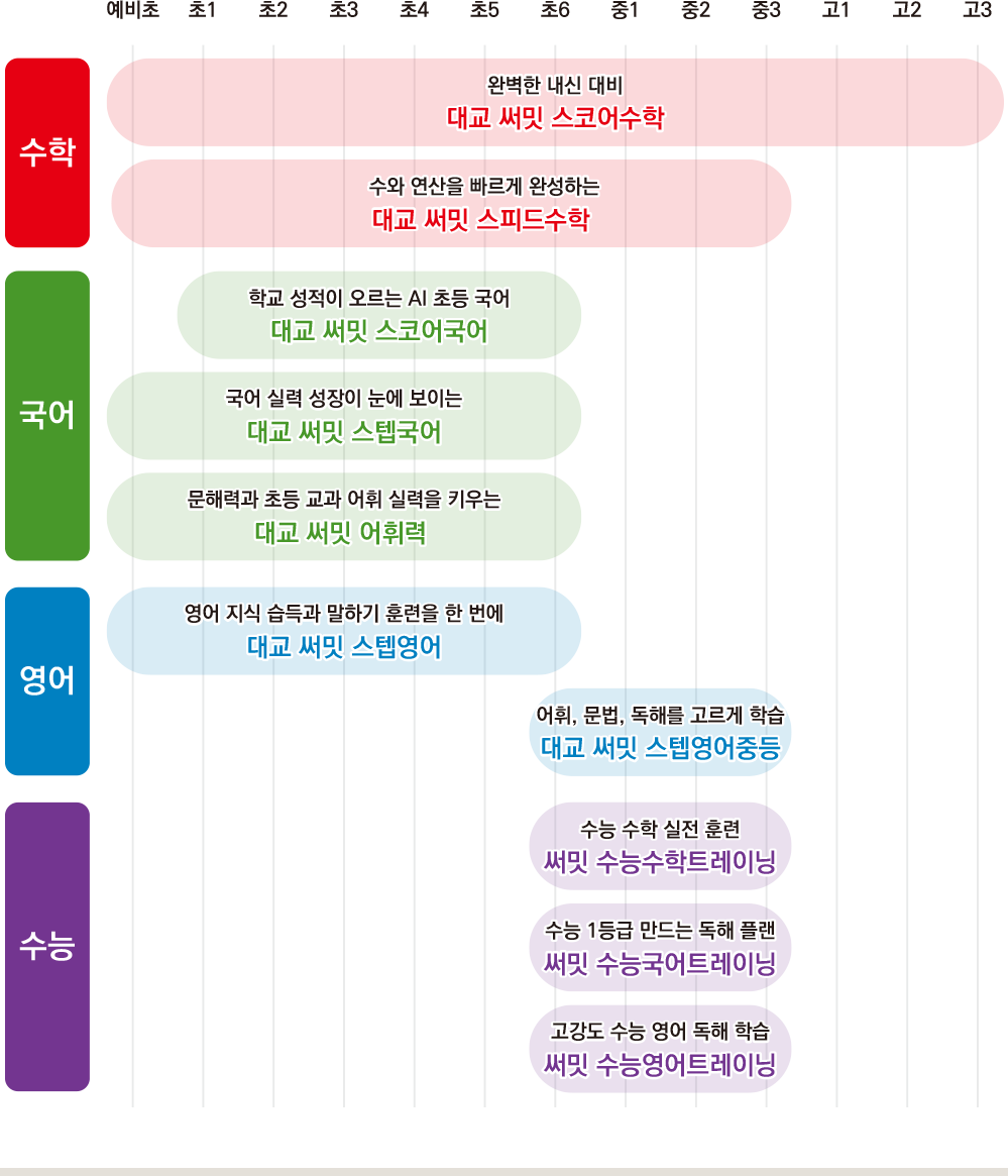 구분 예비초 초1 초2 초3 초4 초5 초6 중1 중2 중3 고1 고2 고3 수학 완벽한 내신 대비 대교 써밋 스코어수학 수와 연산을 빠르게 완성하는 대교 써밋 스피드수학 - 국어 - 학교 성적이 오르는 AI 초등 국어 대교 써밋 스코어국어 - 국어 실력 성장이 눈에 보이는 대교 써밋 스텝국어 - 문해력과 초등 교과 어휘 실력을 키우는 대교 써밋 어휘력 - 영어 - 영어 지식 습득과 말하기 훈련을 한 번에 대교 써밋 스텝영어 - - 어휘, 문법, 독해를 고르게 학습 대교 써밋 스텝영어중등 - - 영어 말하기 자신감의 시작 대교 써밋 스피킹 - 수능 - 수능 1등급 만드는 독해 플랜 써밋 수능국어트레이닝 - 고강도 수능 영어 독해 학습 써밋 수능영어트레이닝 불필요한 콘텐츠는 줄이고, 학습의 깊이는 더하고! 초등부터 고등까지 국·영·수 과목 특화 제품 라인업으로 기초부터 심화까지 완벽 마스터가 가능합니다.