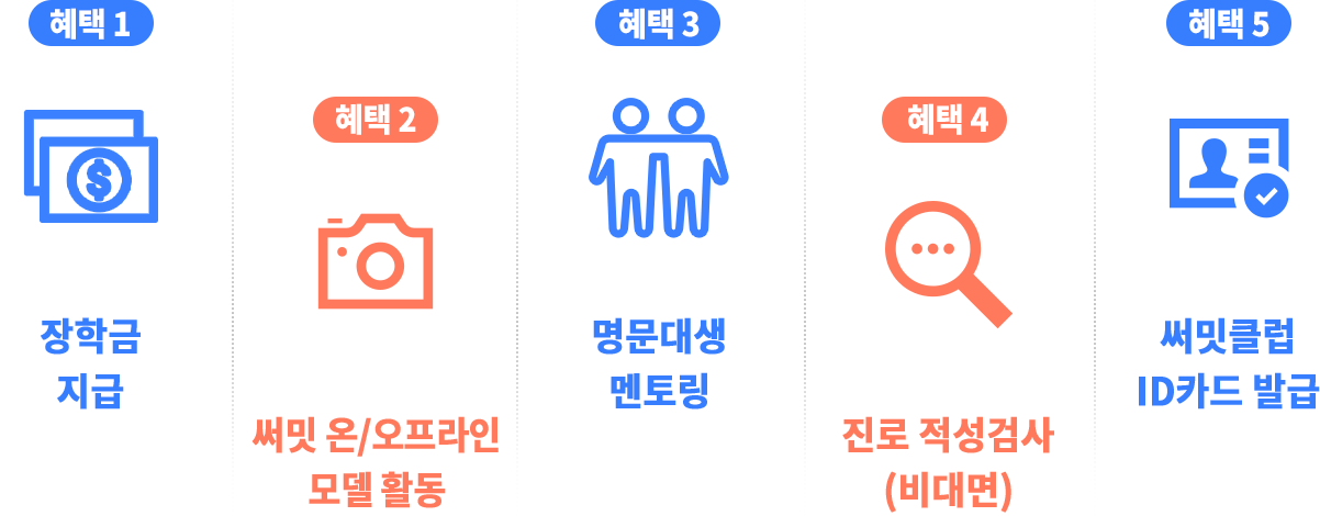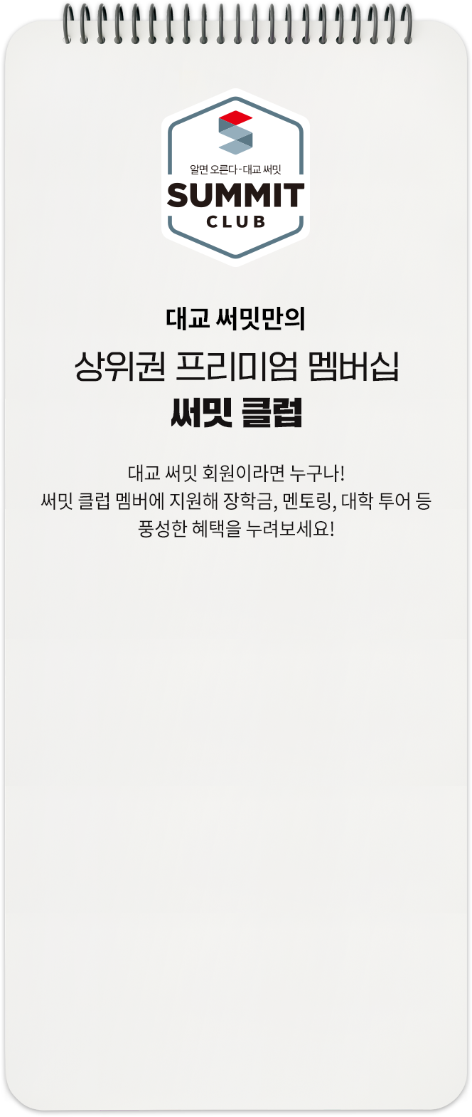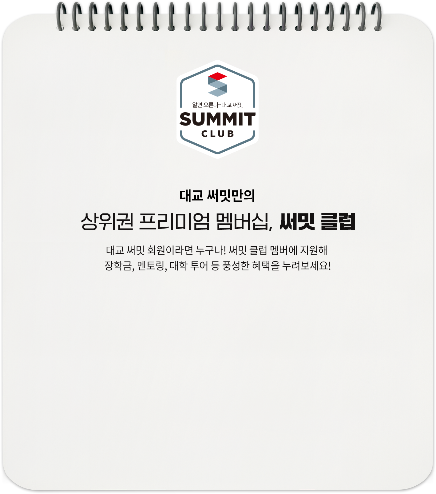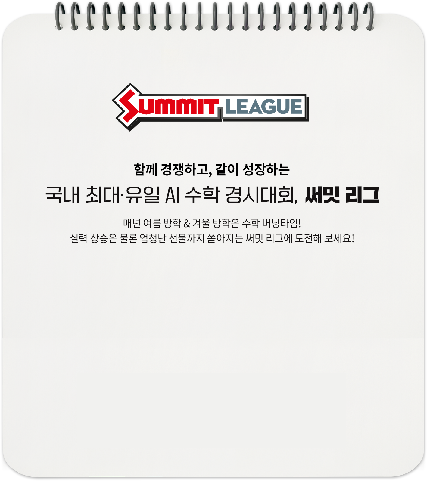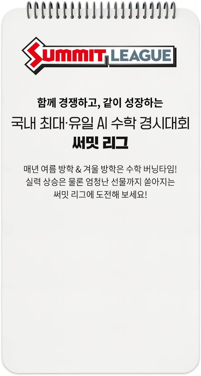 함께 경쟁하고, 같이 성장하는 국내 최대·유일 AI 수학 경시대회, 써밋 리그 매년 여름 방학 & 겨울 방학은 수학 버닝타임! 실력 상승은 물론 엄청난 선물까지 쏟아지는 써밋 리그에 도전해 보세요! 참여자 수 2,628% 증가! 전체 써밋 수학 회원의 98% 참여! 대교 써밋만의 상위권 프리미엄 멤버십, 써밋 클럽 대교 써밋 회원이라면 누구나! 써밋 클럽 멤버에 지원해 장학금, 멘토링, 대학 투어 등 풍성한 혜택을 누려보세요! 혜택 1 장학금 지급 혜택 2 써밋 온/오프라인 모델 활동 혜택 3 명문대생 멘토링 혜택 4 진로 적성검사 (비대면) 혜택 5 써밋클럽 ID카드 발급