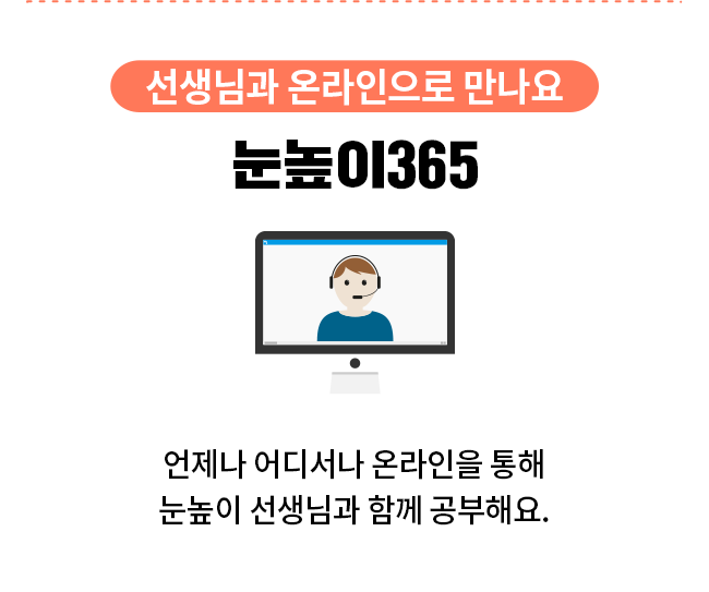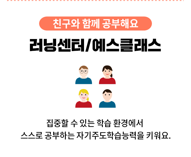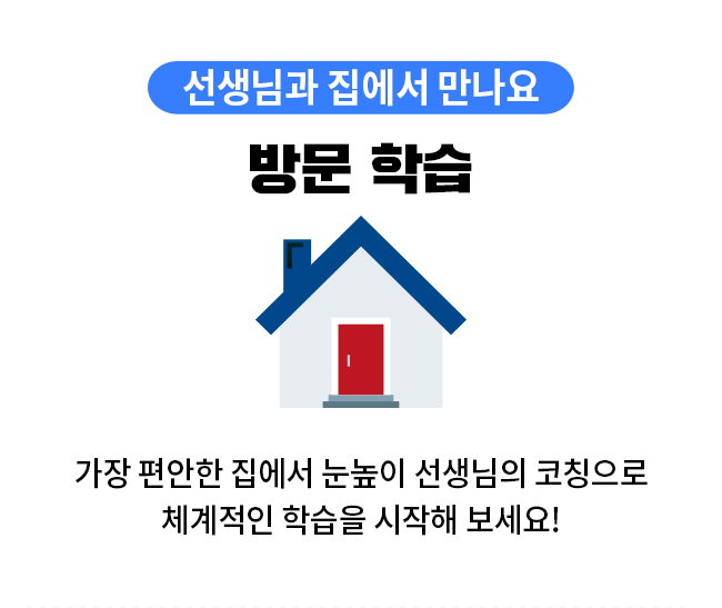 선생님과 집에서 만나요 방문 학습 가장 편안한 집에서 눈높이 선생님의 코칭으로 체계적인 학습을 시작해 보세요! 친구와 함께 공부해요 러닝센터/예스클래스 집중할 수 있는 학습 환경에서 스스로 공부하는 자기주도학습능력을 키워요. 디지털로 전과목을 공부해요 대교 써밋 클래스 가장 가까운 디지털 공부방, 대교 써밋 클래스에서는 AI를 통해 전과목 맞춤형 자기주도학습이 가능해요. 선생님과 온라인으로 만나요 눈높이365 언제나 어디서나 온라인을 통해 눈높이 선생님과 함께 공부해요.