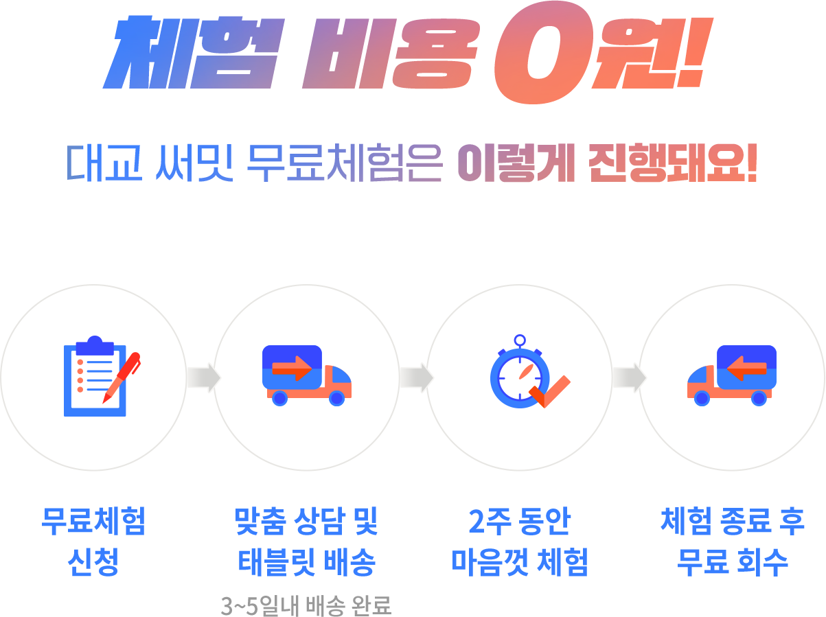 체험 비용 0원! 대교 써밋 무료체험은 이렇게 진행돼요! 무료체험 신청 맞춤 상담 및 태블릿 배송 3~5일내 배송 완료 2주 동안 마음껏 체험 체험 종료 후 무료 회수 무료체험신청하기